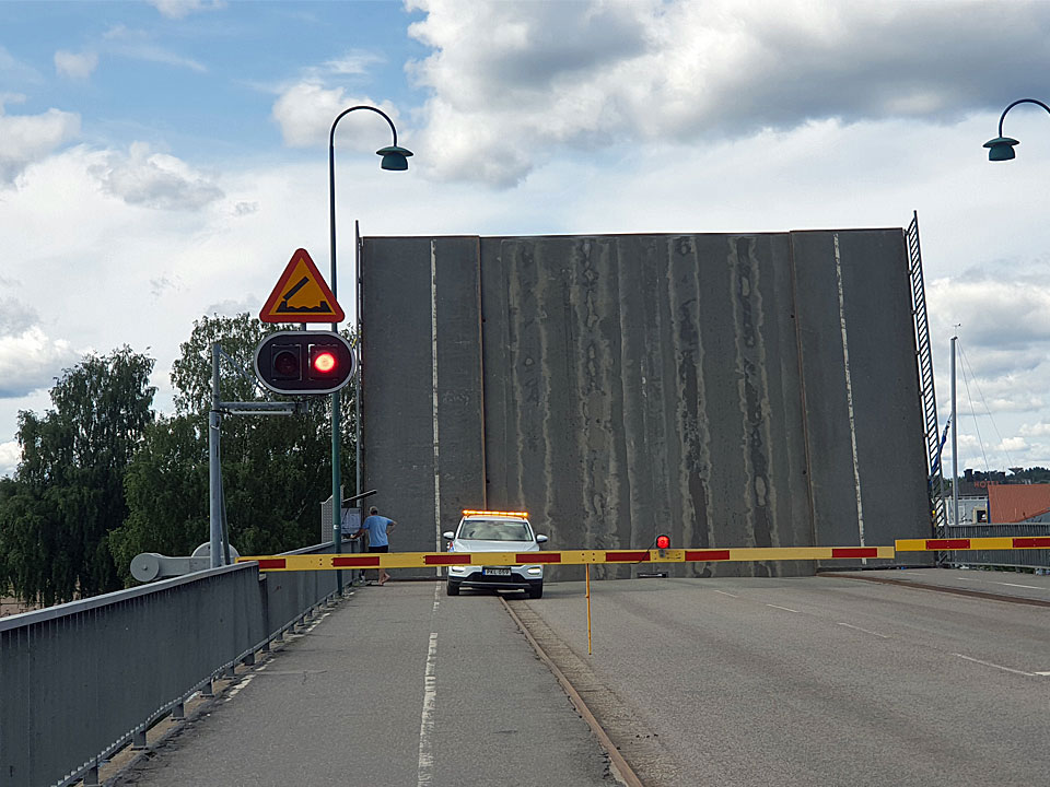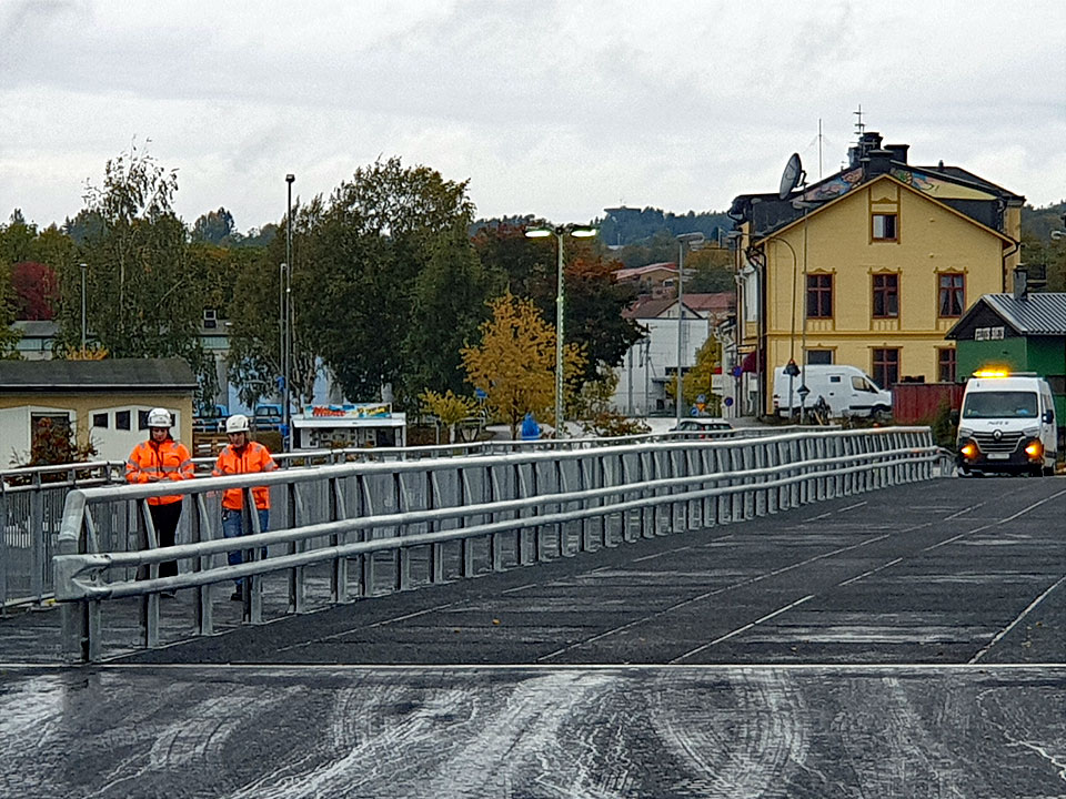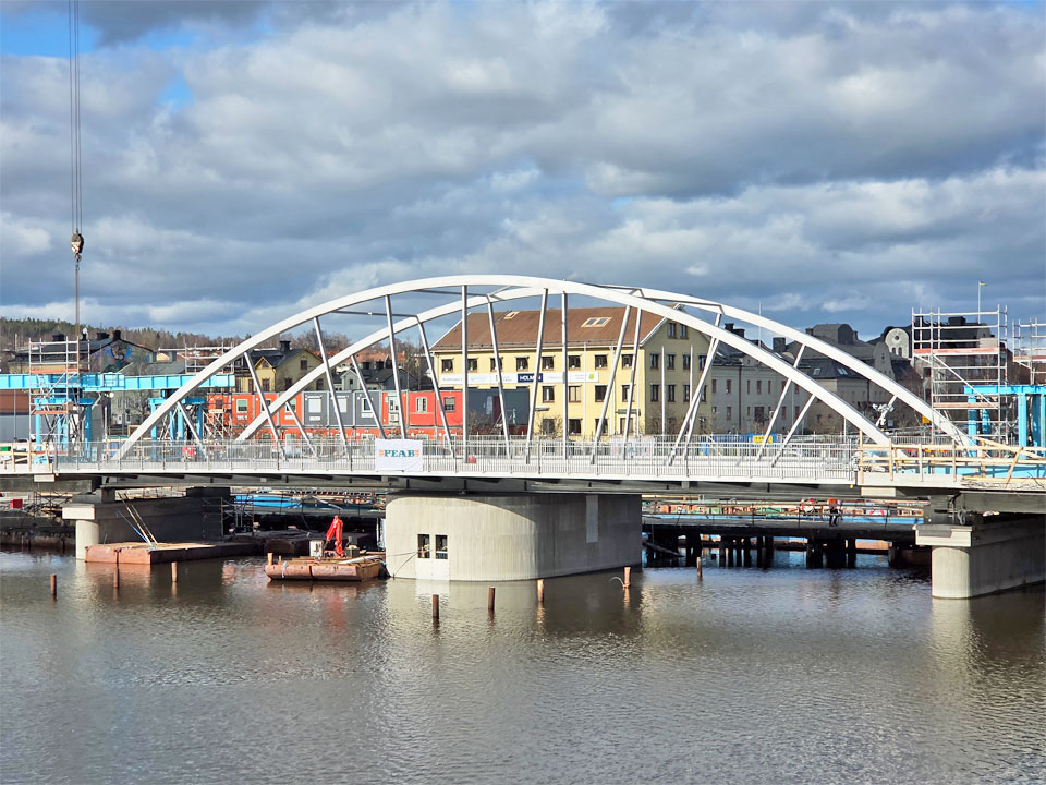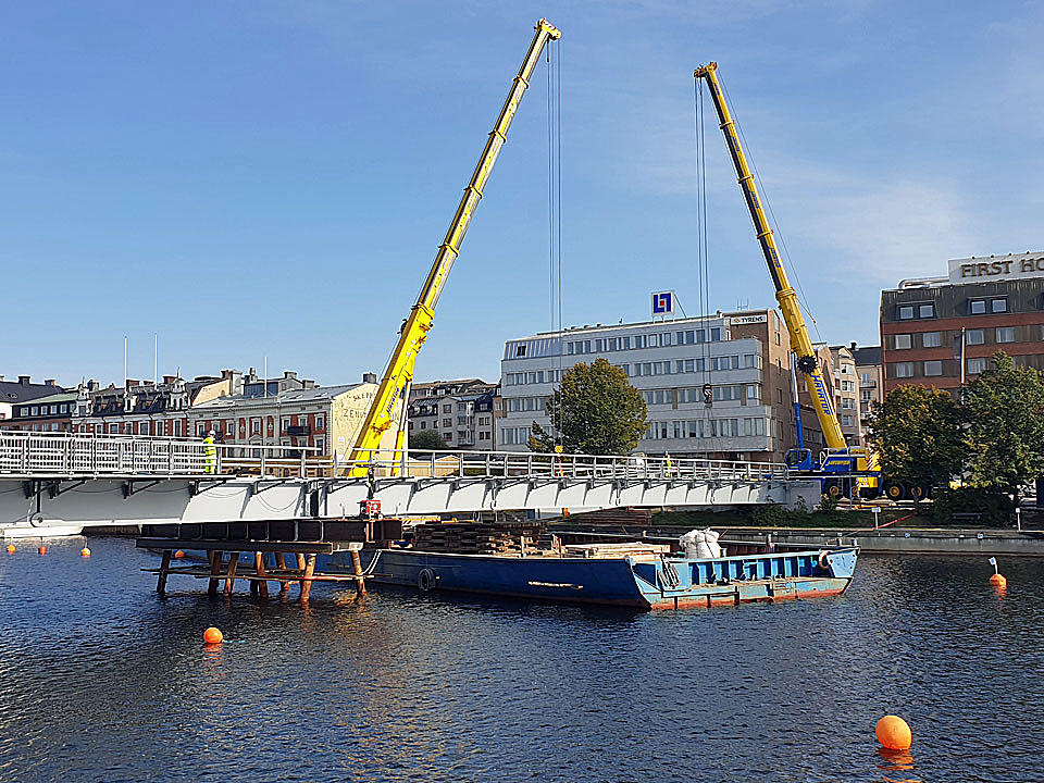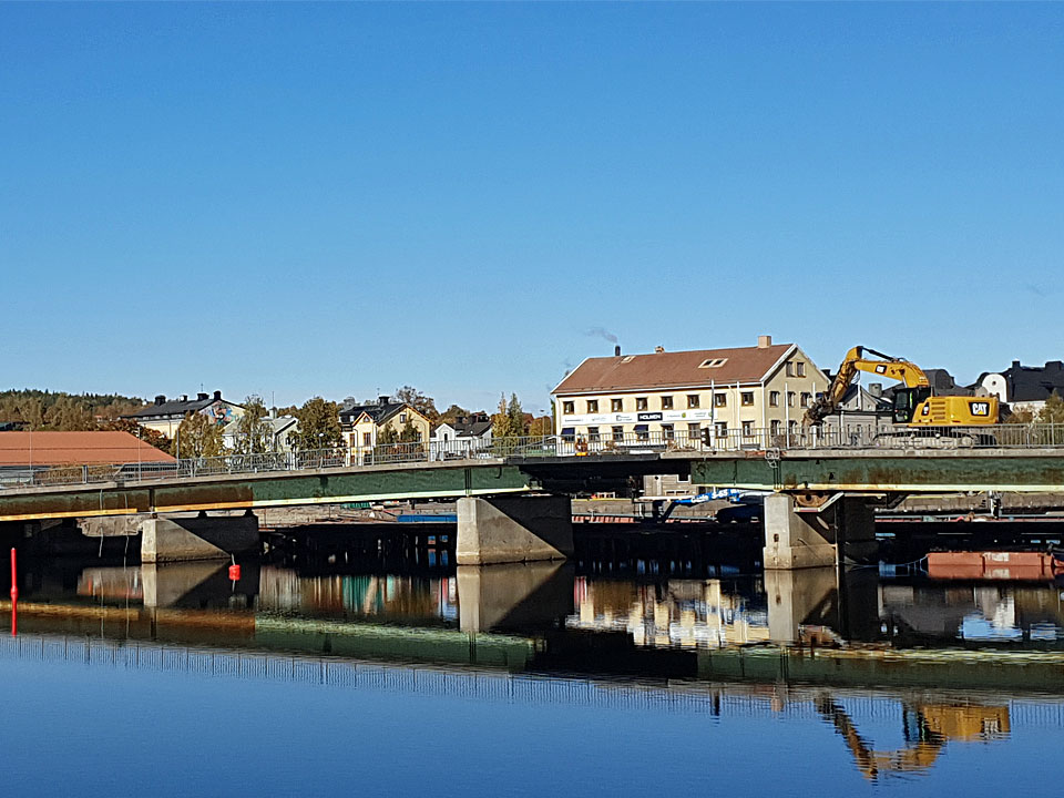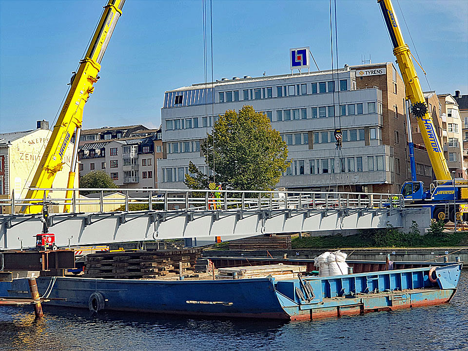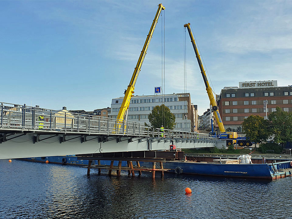 Nybron invigdes 1938 / Den nuvarande klaffbron invigdes 1937. Den nya bron ska heta Nybron och det blir en bågbro som ska vara i stil med den allra första bron som byggdes i slutet av 1800-talet. Den nya bron ska också ha en vridbar öppningsdel i mitten för att släppa igenom båttrafik. Under tiden bron byggs kommer Peab att bygga en tillfällig bro för att lösa den befintliga trafiken. Byggstart i juni 2024. Bron planeras tas i drift i juni 2026.