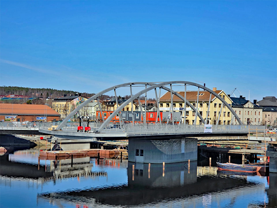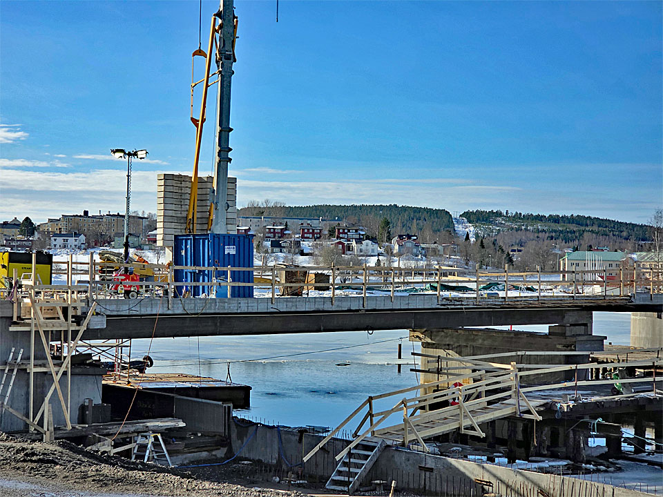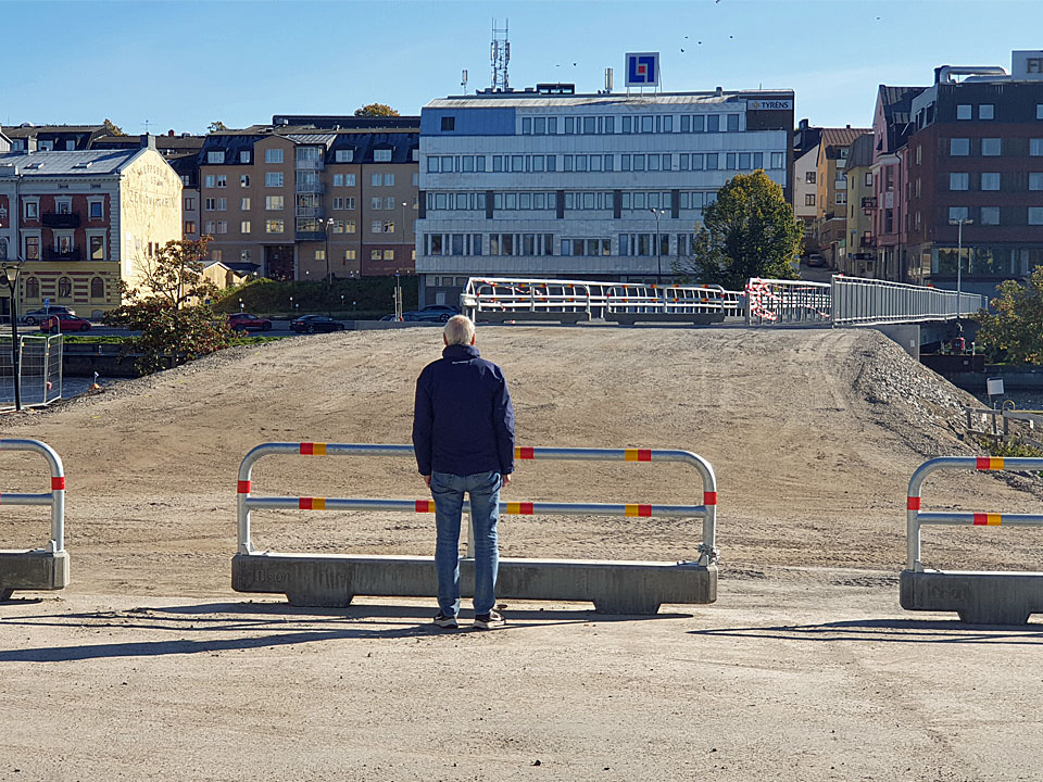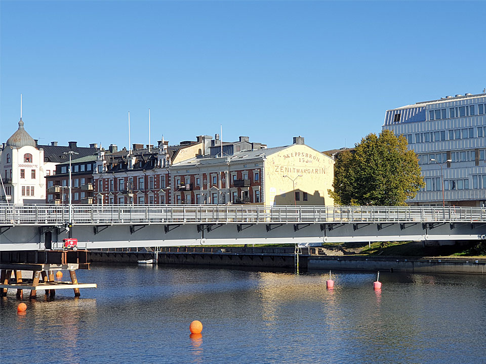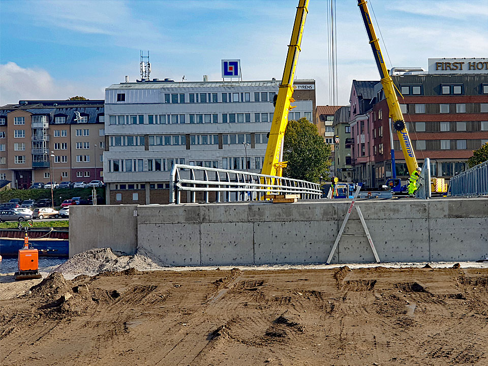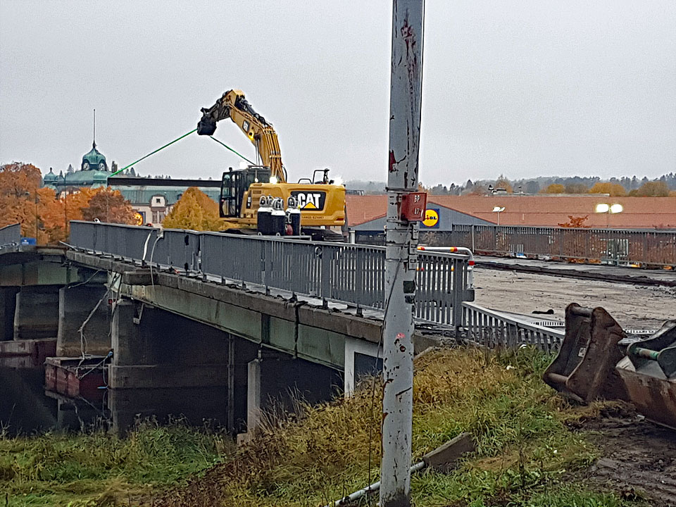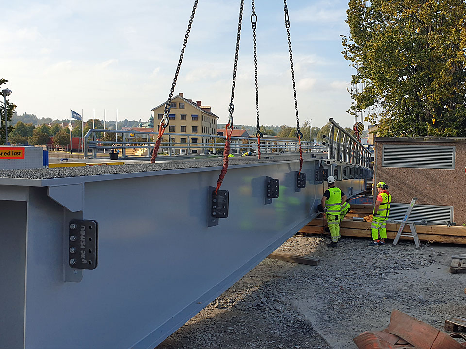 Nybron invigdes 1938 / Den nuvarande klaffbron invigdes 1937. Den nya bron ska heta Nybron och det blir en bågbro som ska vara i stil med den allra första bron som byggdes i slutet av 1800-talet. Den nya bron ska också ha en vridbar öppningsdel i mitten för att släppa igenom båttrafik. Under tiden bron byggs kommer Peab att bygga en tillfällig bro för att lösa den befintliga trafiken. Byggstart i juni 2024. Bron planeras tas i drift i juni 2026.