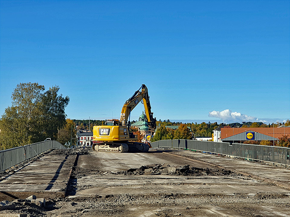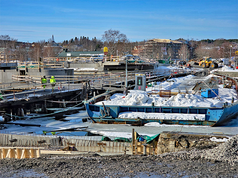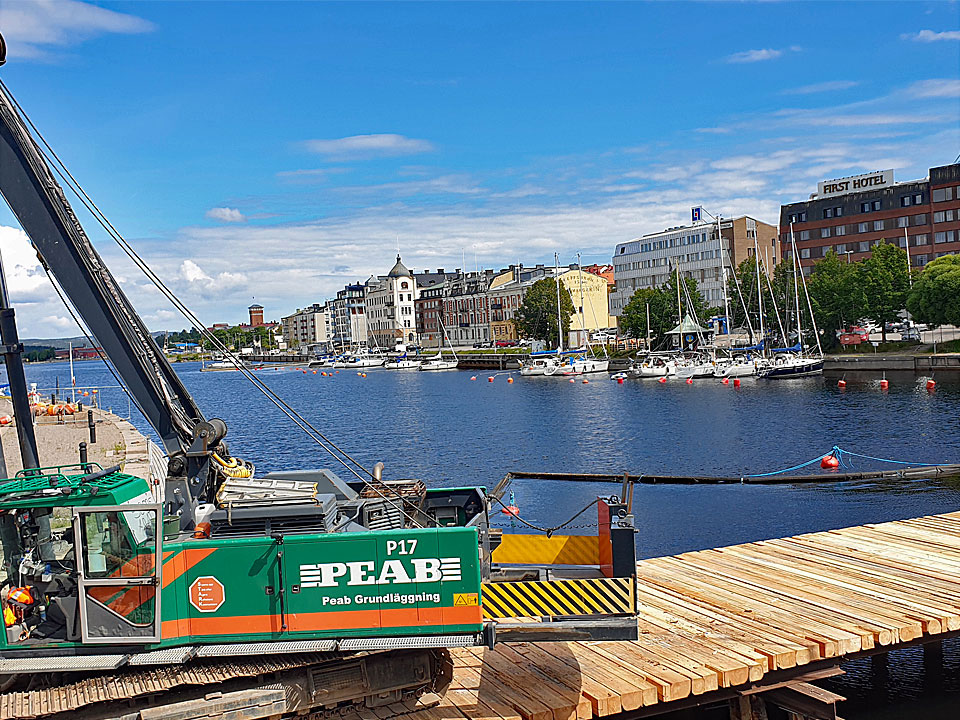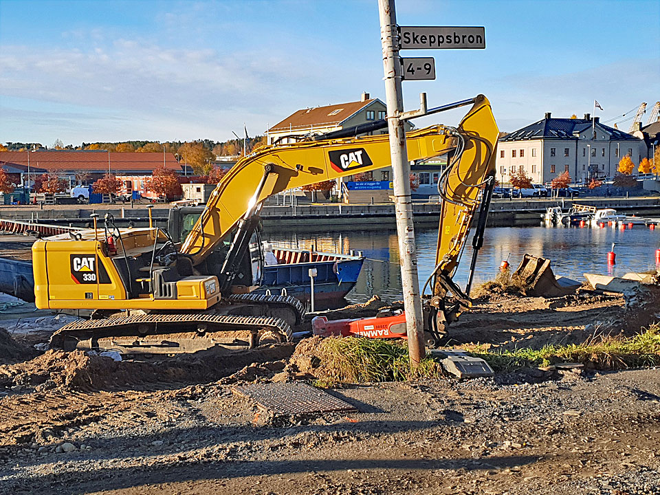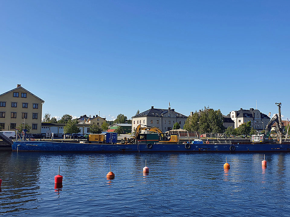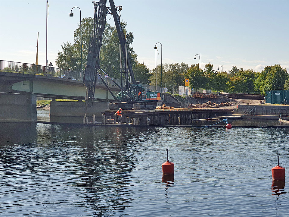 Projekt Nya Nybron! Härnösands Schakt & Trädgårdsanläggningar. För PEAB river vi nu fundamenten från gamla Nybron i Härnösand och gräver ner 3 meter under vattenytan för nya brofästet på fastlandssidan. Cementbitarna rasar vid knackning ner på botten, grävs därefter upp och körs till Hemabs deponi. Djupet i kanalen är som 4-5 meter och det är inga problem att nå botten med grävmaskinens långa arm som har en räckvidd på 18-19 meter. Alla gamla fundament ska knackas ner, grävas upp och köras bort. Formen i spontat trä som nu står på pråmen ska så småningom lyftas ut i vattnet med hjälp av en 300 tons mobilkran och där inuti ska sedan fundamentet till nya bron gjutas. Trät sväller och tätas i vattnet och pumpar kommer placeras inuti formen för att hålla vattnet utanför. Samtidigt pålas för tillfälliga arbetsytor intill de nya fundamenten. På fastlandssidan byggs nu nästa spåntlåda som ska bli form för nästa fundament.