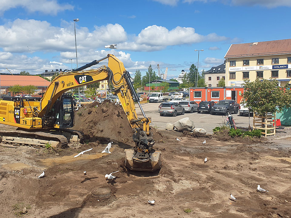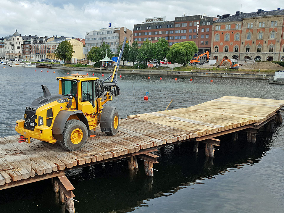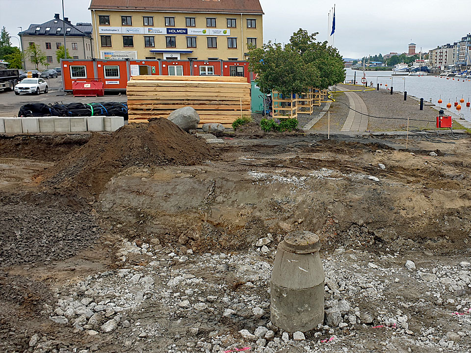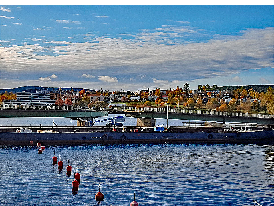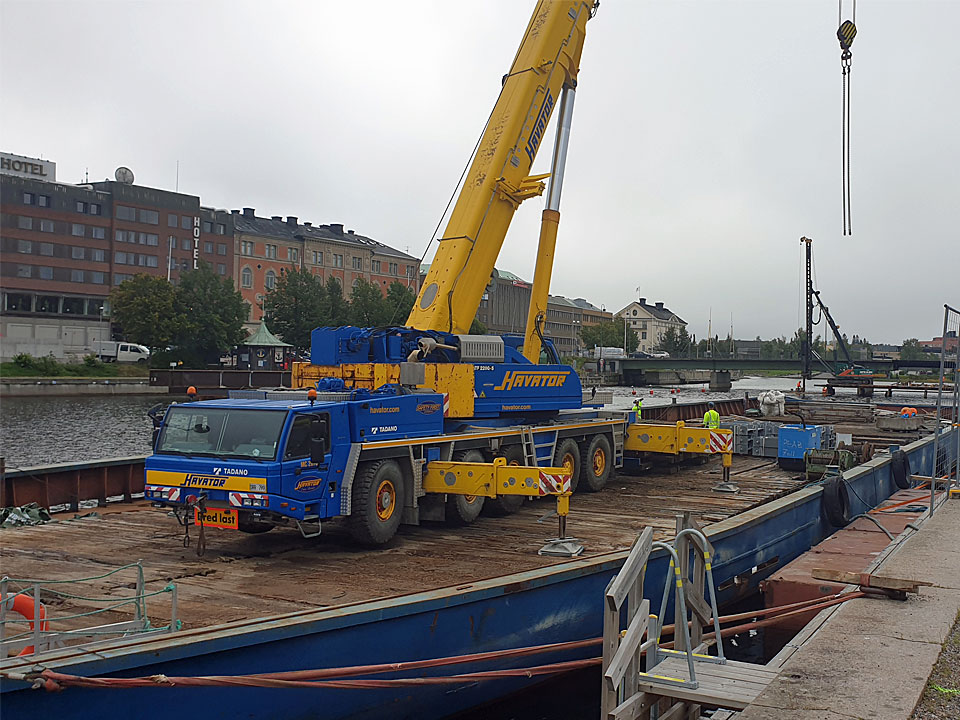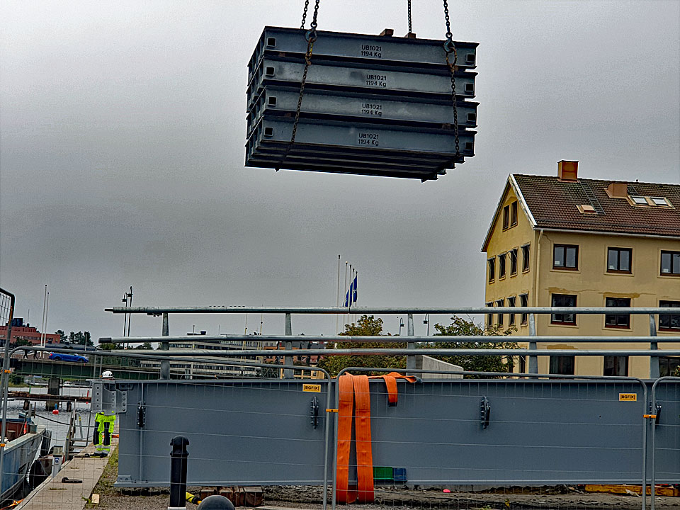 Projekt Nya Nybron! Härnösands Schakt & Trädgårdsanläggningar. För PEAB river vi nu fundamenten från gamla Nybron i Härnösand och gräver ner 3 meter under vattenytan för nya brofästet på fastlandssidan. Cementbitarna rasar vid knackning ner på botten, grävs därefter upp och körs till Hemabs deponi. Djupet i kanalen är som 4-5 meter och det är inga problem att nå botten med grävmaskinens långa arm som har en räckvidd på 18-19 meter. Alla gamla fundament ska knackas ner, grävas upp och köras bort. Formen i spontat trä som nu står på pråmen ska så småningom lyftas ut i vattnet med hjälp av en 300 tons mobilkran och där inuti ska sedan fundamentet till nya bron gjutas. Trät sväller och tätas i vattnet och pumpar kommer placeras inuti formen för att hålla vattnet utanför. Samtidigt pålas för tillfälliga arbetsytor intill de nya fundamenten. På fastlandssidan byggs nu nästa spåntlåda som ska bli form för nästa fundament.