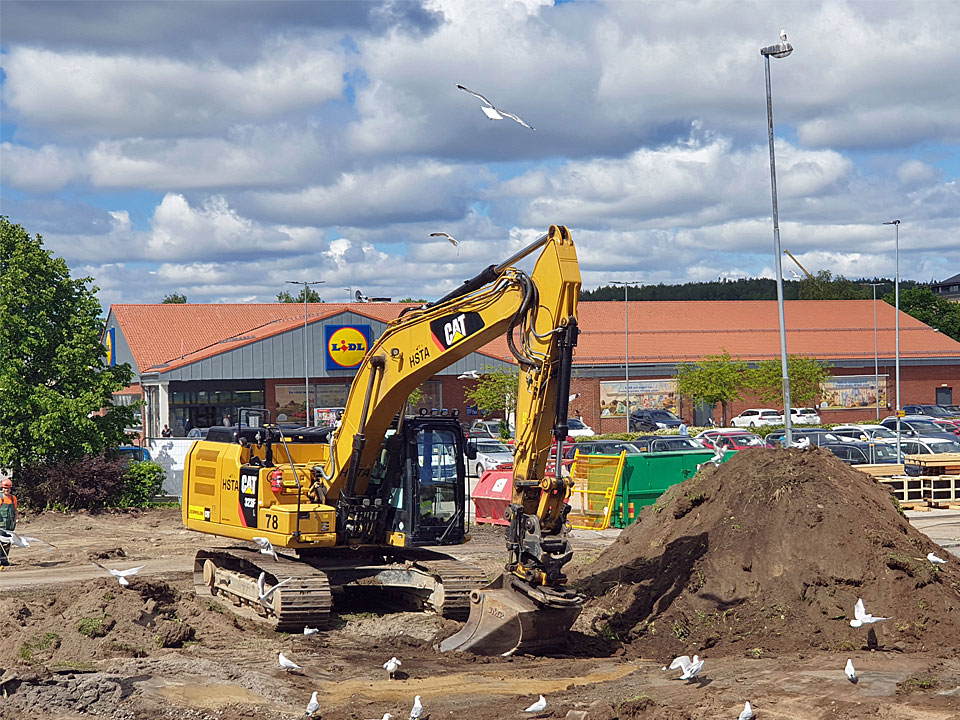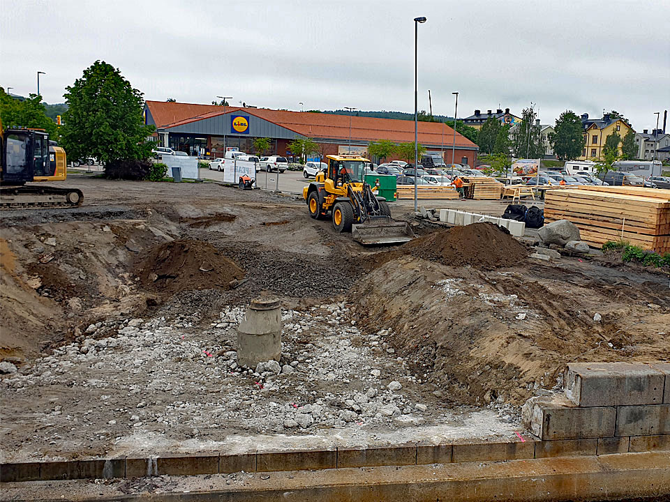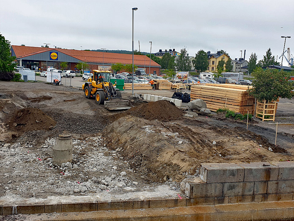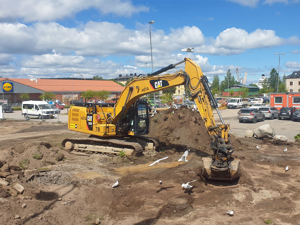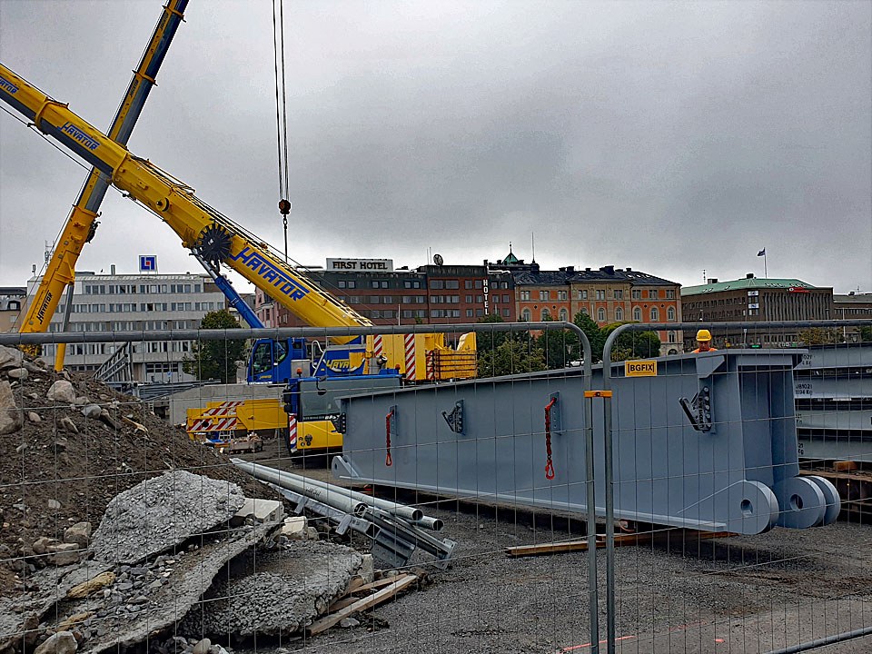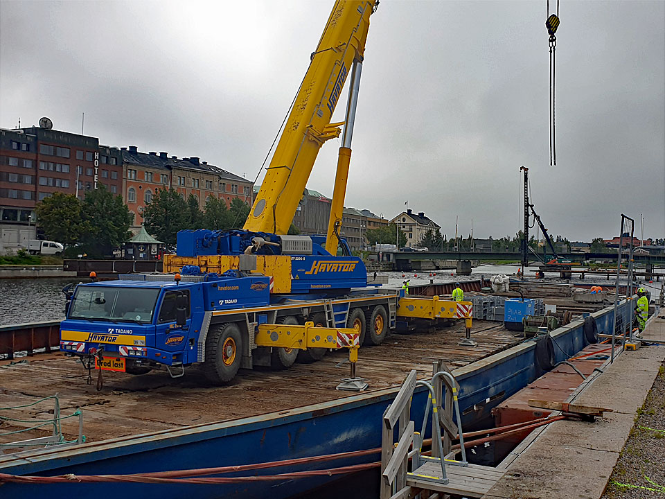 Projekt Nya Nybron! Härnösands Schakt & Trädgårdsanläggningar. För PEAB river vi nu fundamenten från gamla Nybron i Härnösand och gräver ner 3 meter under vattenytan för nya brofästet på fastlandssidan. Cementbitarna rasar vid knackning ner på botten, grävs därefter upp och körs till Hemabs deponi. Djupet i kanalen är som 4-5 meter och det är inga problem att nå botten med grävmaskinens långa arm som har en räckvidd på 18-19 meter. Alla gamla fundament ska knackas ner, grävas upp och köras bort. Formen i spontat trä som nu står på pråmen ska så småningom lyftas ut i vattnet med hjälp av en 300 tons mobilkran och där inuti ska sedan fundamentet till nya bron gjutas. Trät sväller och tätas i vattnet och pumpar kommer placeras inuti formen för att hålla vattnet utanför. Samtidigt pålas för tillfälliga arbetsytor intill de nya fundamenten. På fastlandssidan byggs nu nästa spåntlåda som ska bli form för nästa fundament.