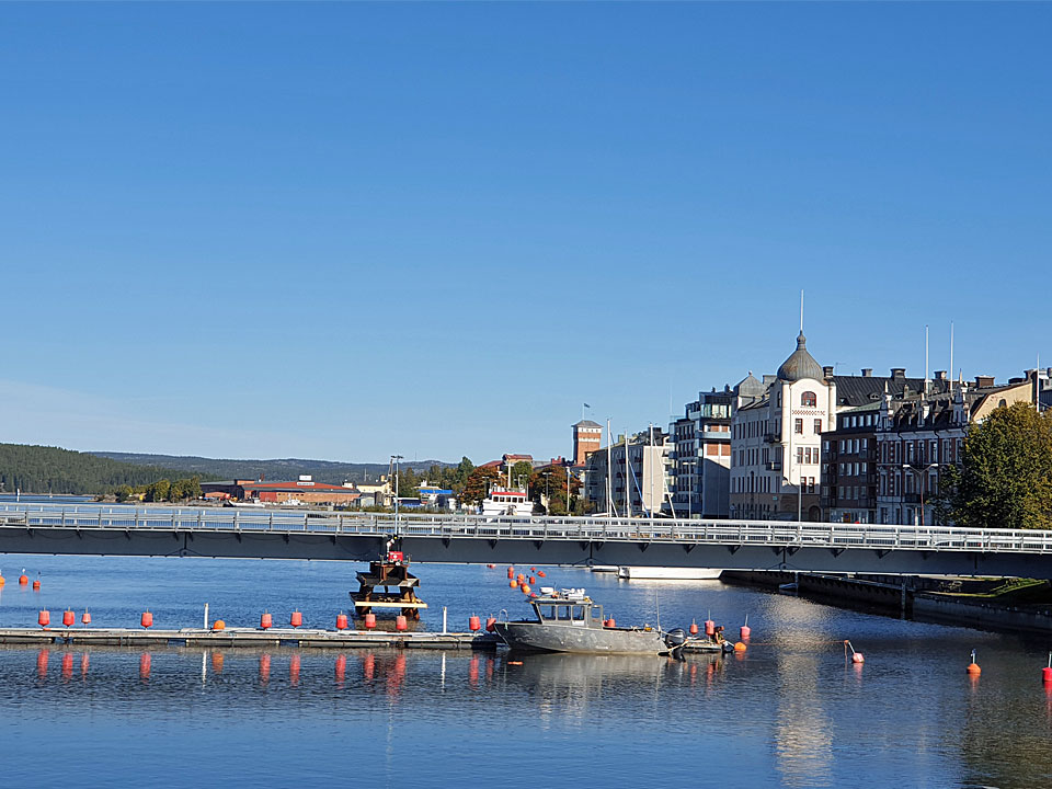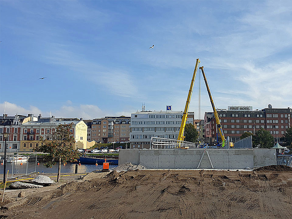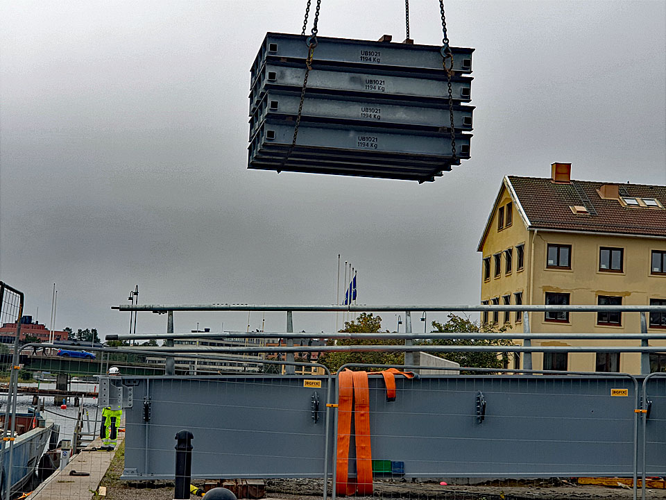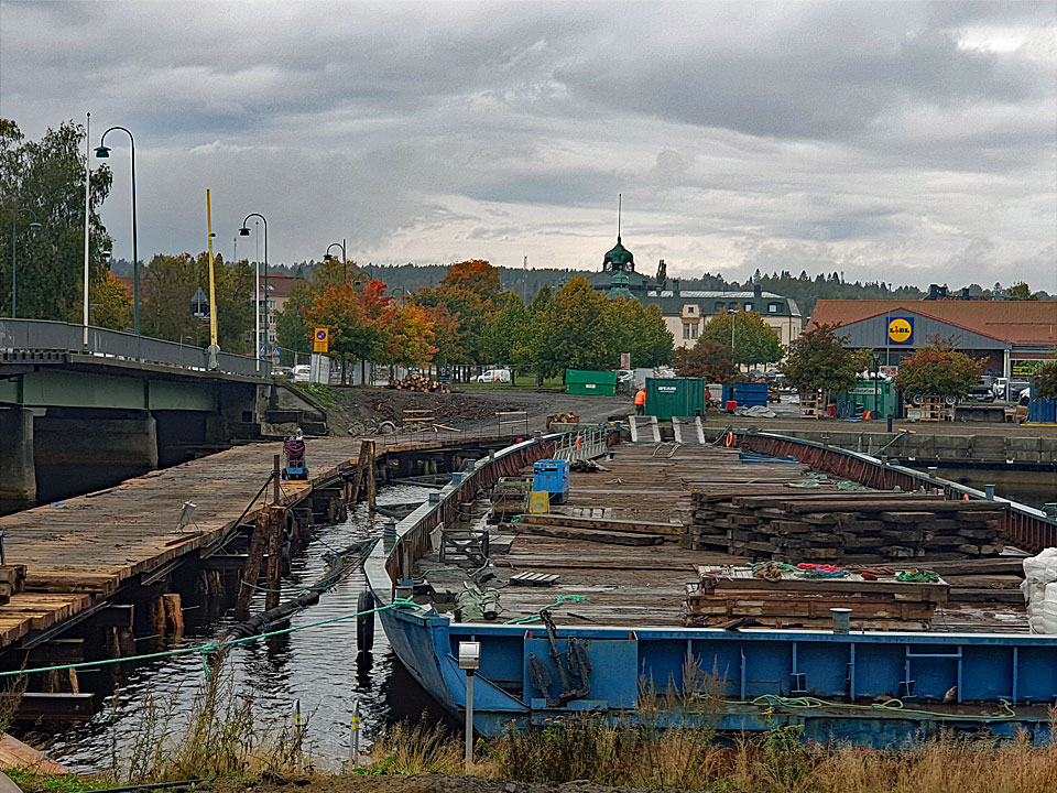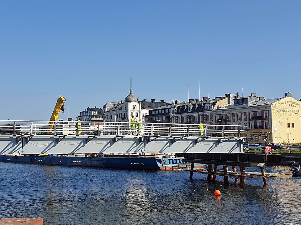 Temporär bro mellan Kronholmen och Skeppsbron Härnösand. Den nuvarande bron invigdes 1938 och behöver ersättas av en ny. Bygget kommer att pågå 2024-2026.