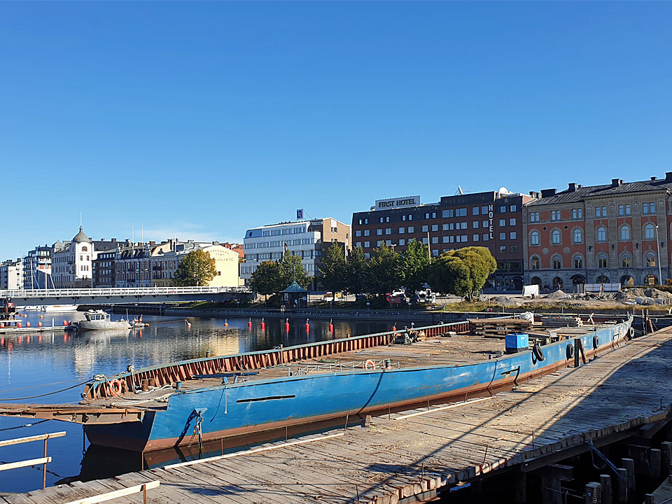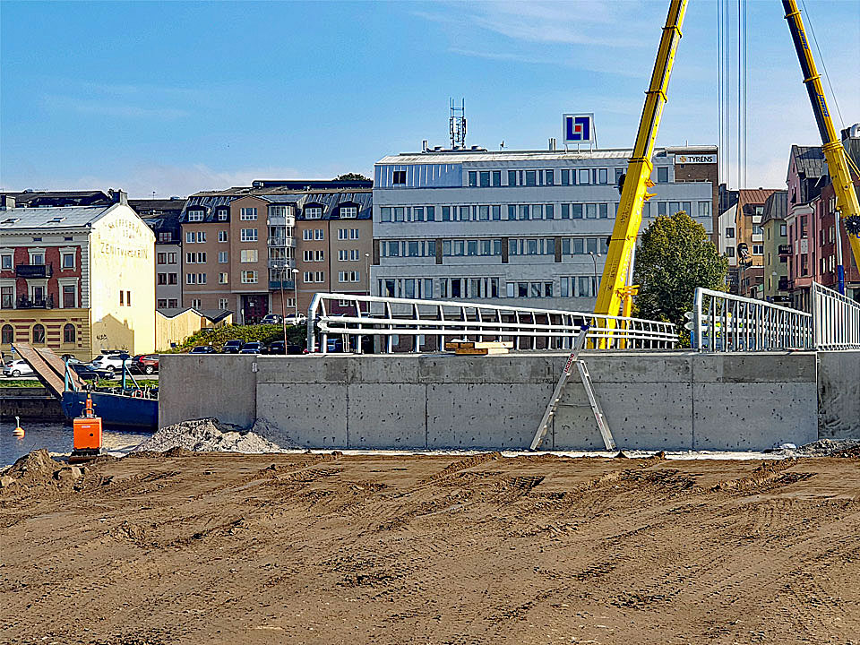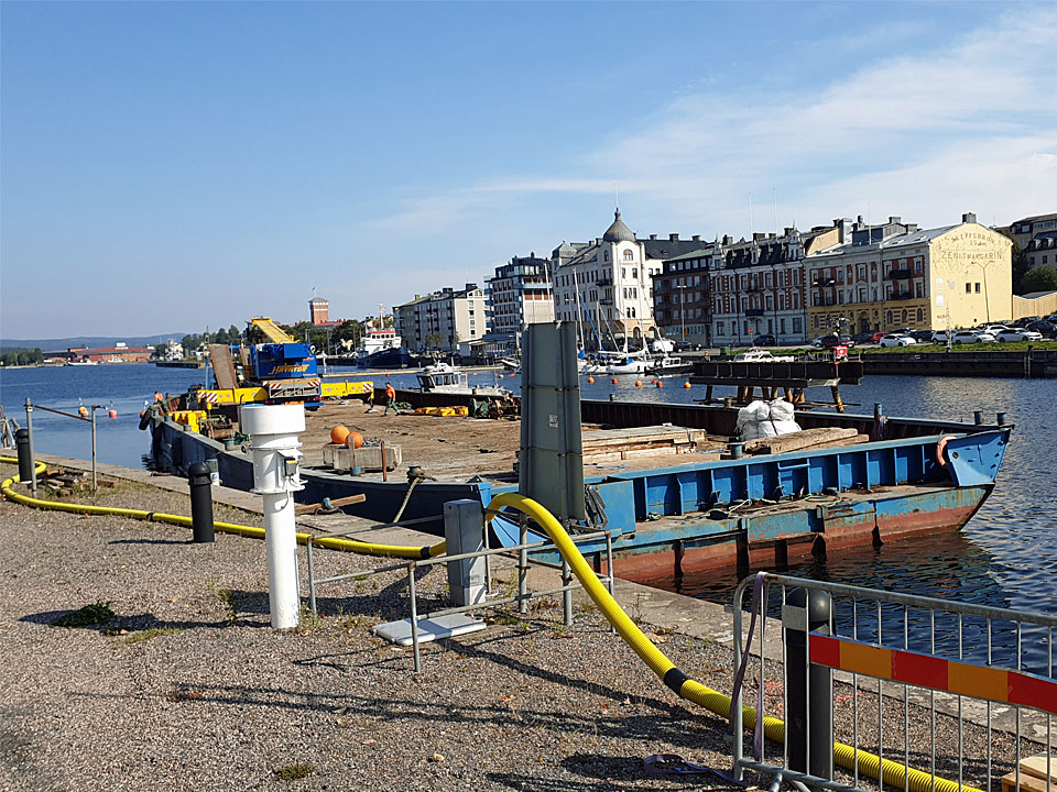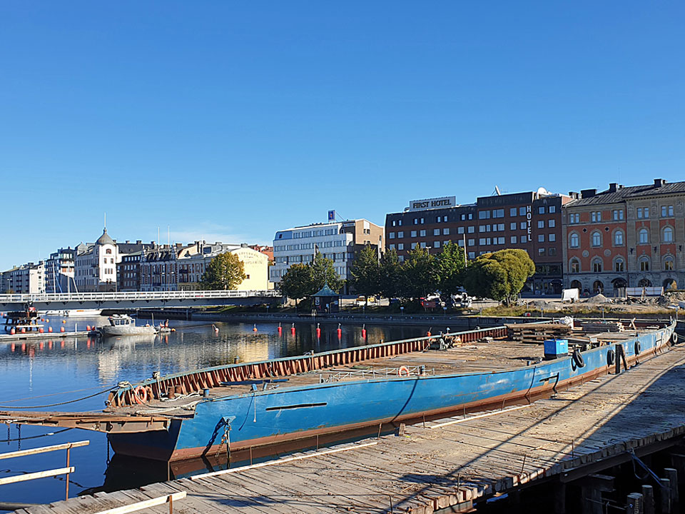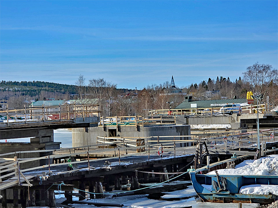 Temporär bro mellan Kronholmen och Skeppsbron Härnösand. Den nuvarande bron invigdes 1938 och behöver ersättas av en ny. Bygget kommer att pågå 2024-2026.